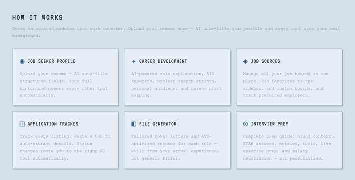 Profile Intelligence — Builds a dynamic candidate profile from resume, work history, skills, and career goals to serve as the engine behind all optimization.